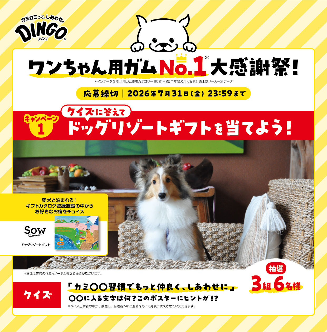 スペクトラム ブランズ ジャパン株式会社以下「主催者」といいます)が実施する「DINGO ワンちゃん用ガムNo.1 大感謝祭!クイズに答えてドッグリゾートを当てよう!」(以下「本キャンペーン」といいます)にご応募いただく前に、本規約をよくお読みください。本キャンペーンに応募された場合、本規約に同意したものとみなします。